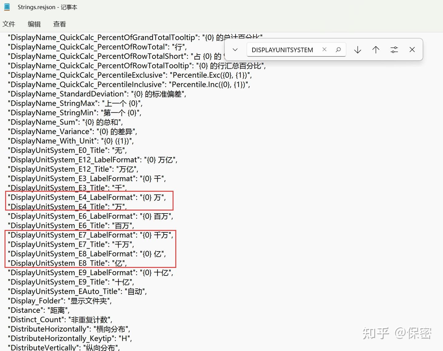 1、在PowerBI Desktop安装目录下(盘符:\Program Files\Microsoft Power BI Desktop\bin\zh-HANS)依次进入到zh-HANS,找到Strings.rejson文件,用记事本打开,查找(关键字:DisplayUnitSystem)如图位置,增加修改对应的行即可实现。